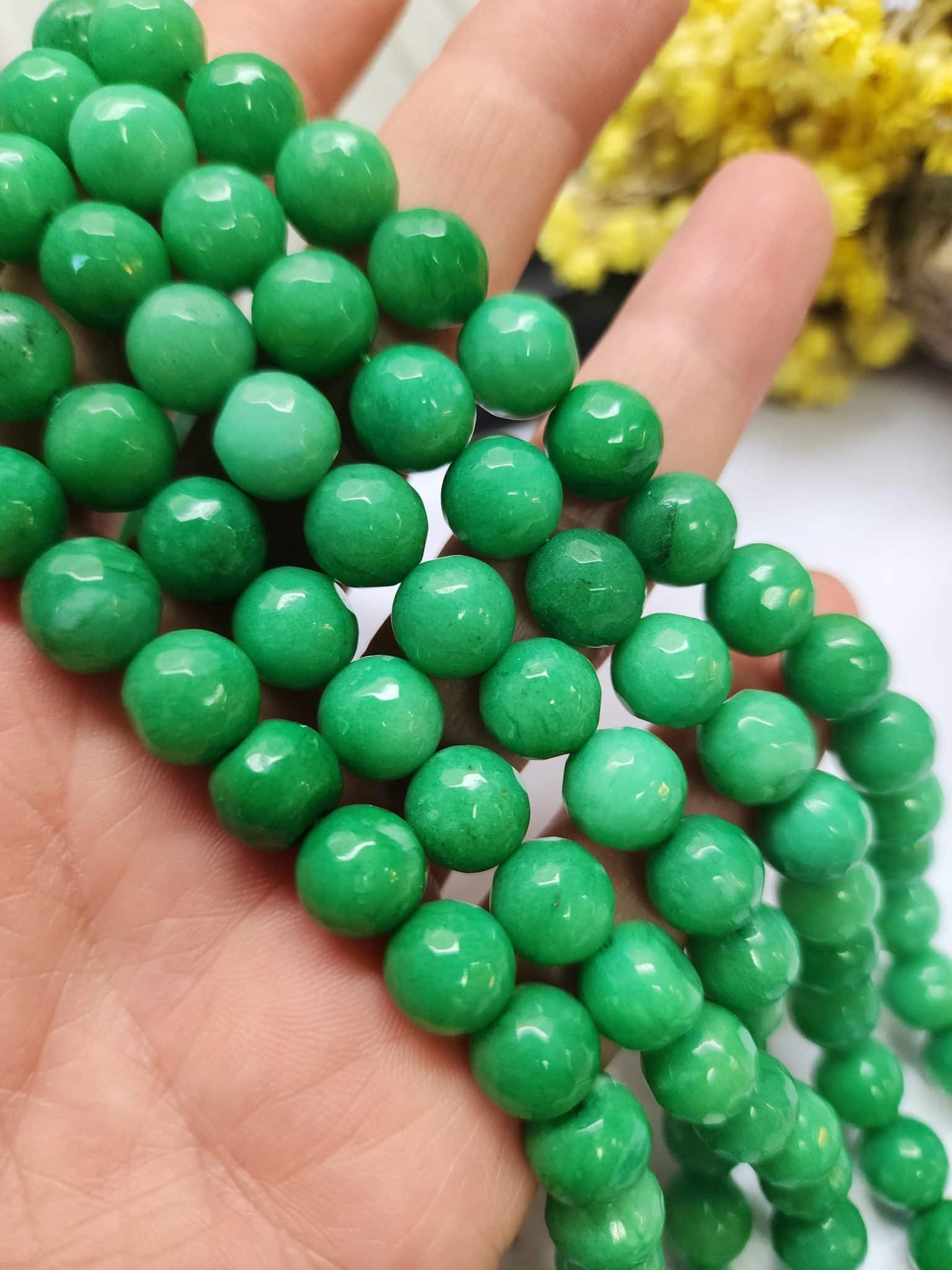 - 1 dizi 10 MM Faset Zümrüt renkli ceyt doğal tasında 37-38 adet tanecik bulunur.