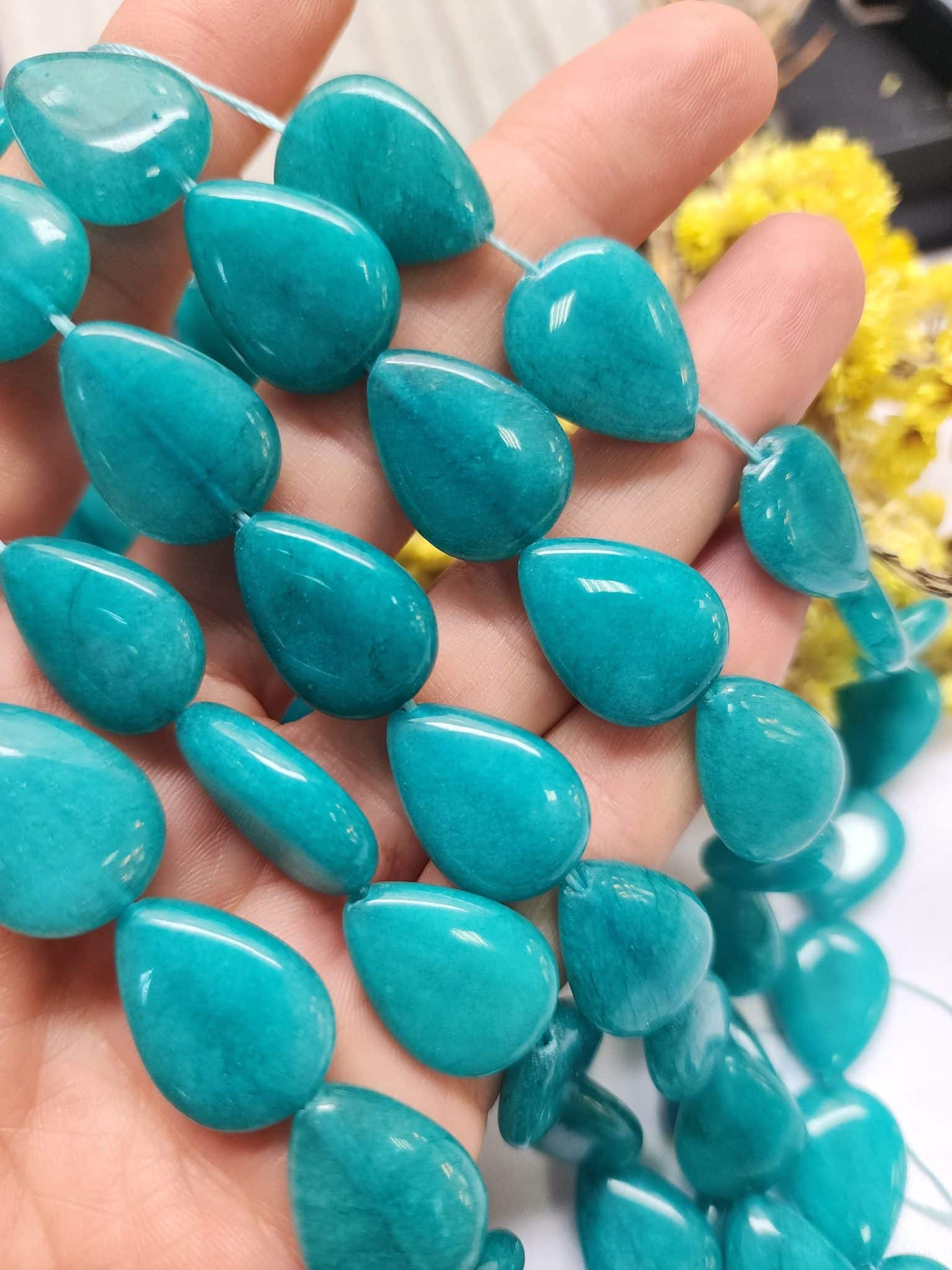 - 1 dizi Damla Mavi renkli ceyt doğal tasında 20 adet tanecik bulunur.