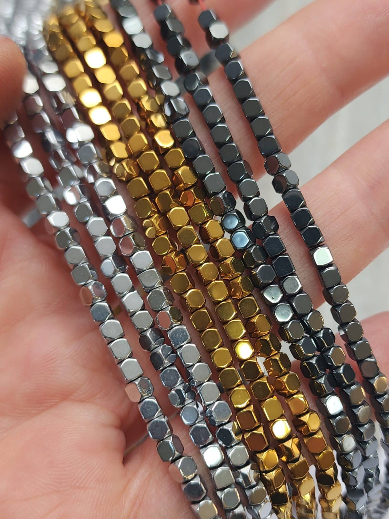 - 1 dizi 3×3 mm köşesiz küp hematit doğal taşı 120-125 adetten oluşur.