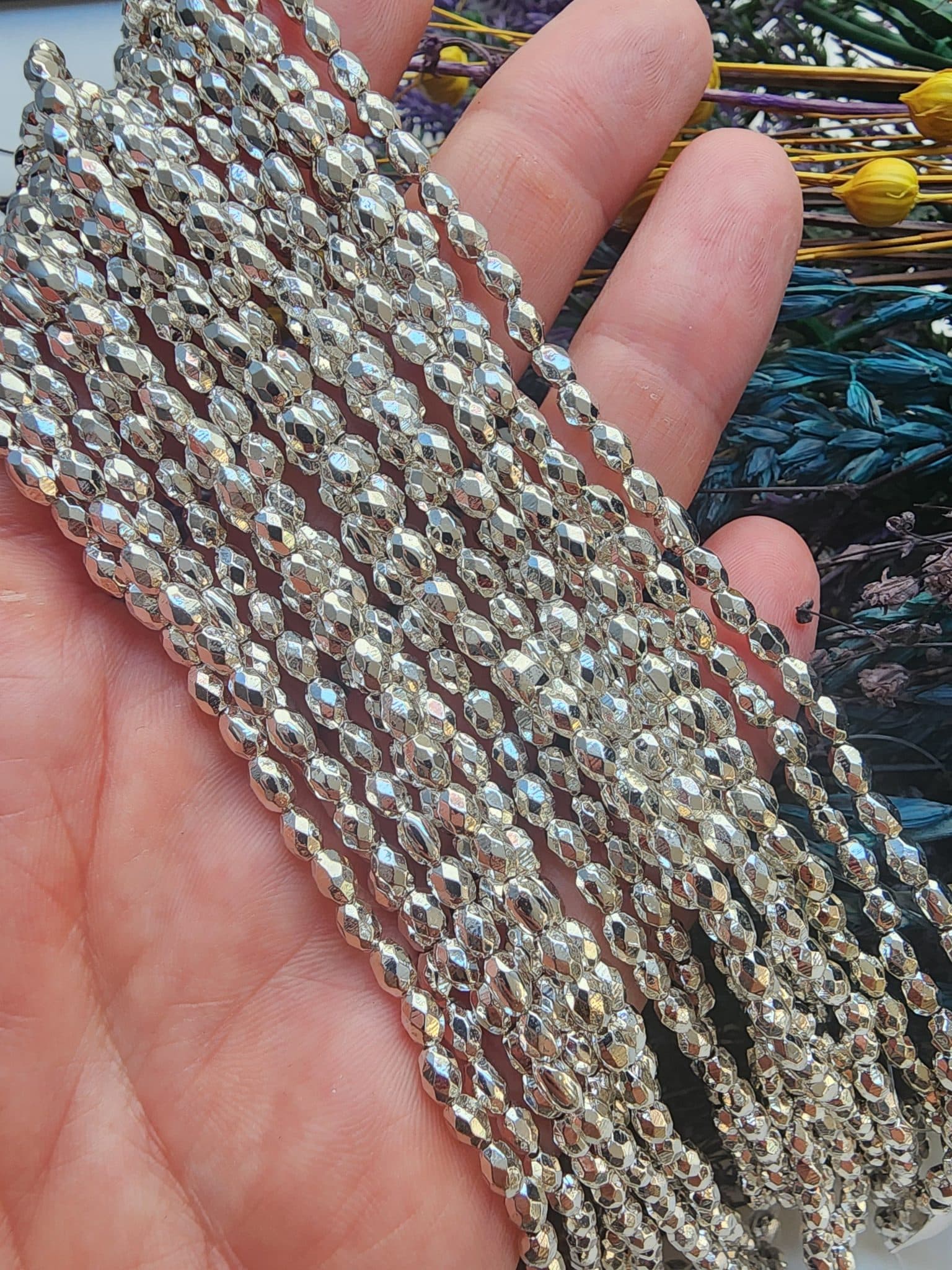 - 1 dizi fasetli arpa hematit 3×4 mm doğal taşı 90 adetten oluşur.