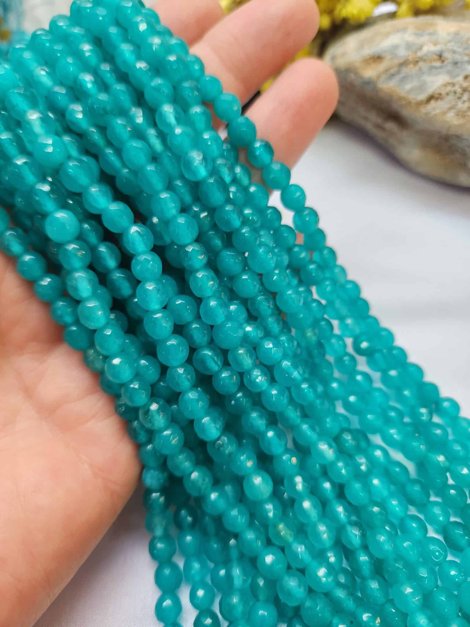 - 1 dizi 6 MM Faset Turkuaz renkli ceyt doğal tasında 58-60 adet tanecik bulunur.