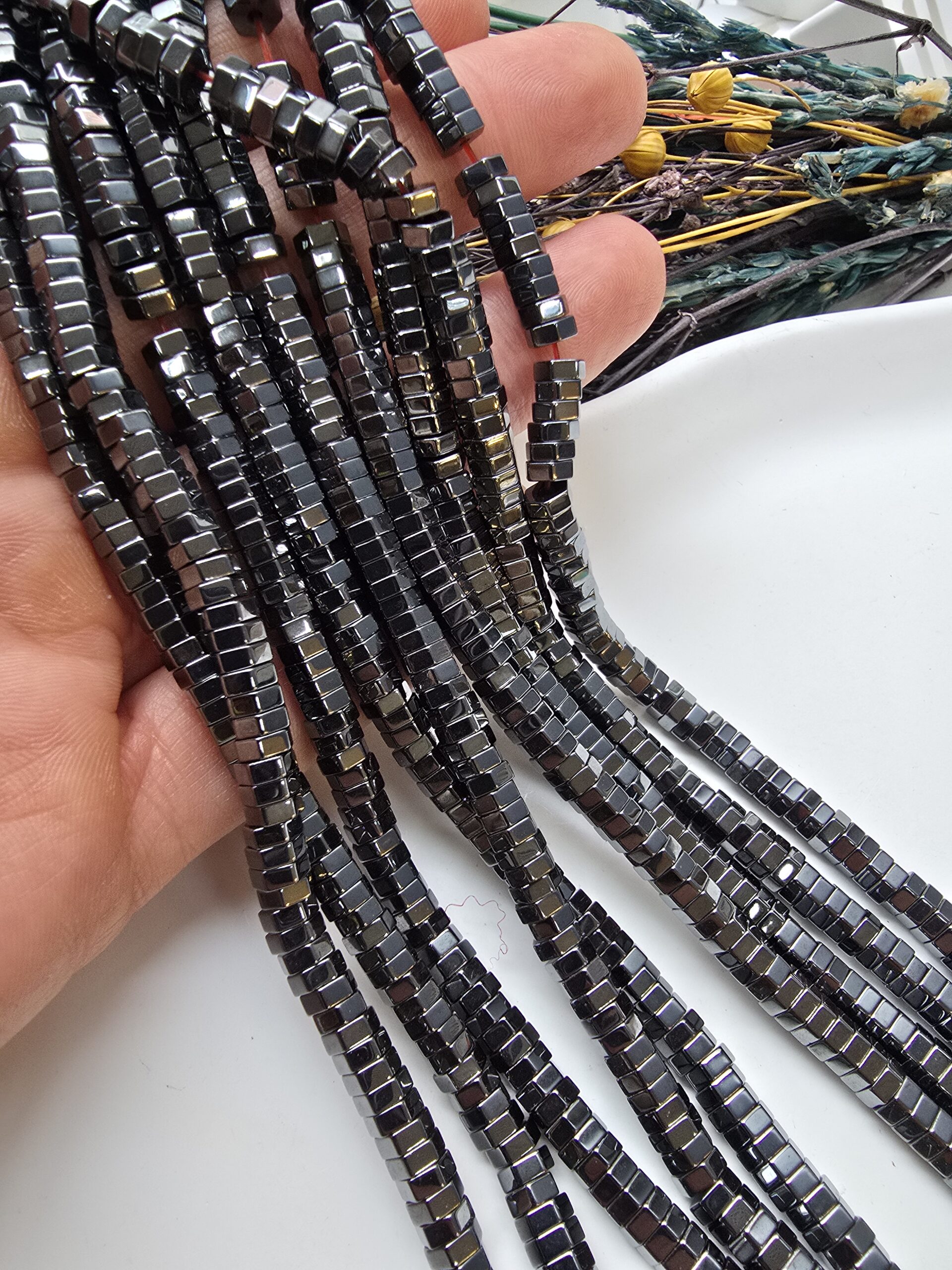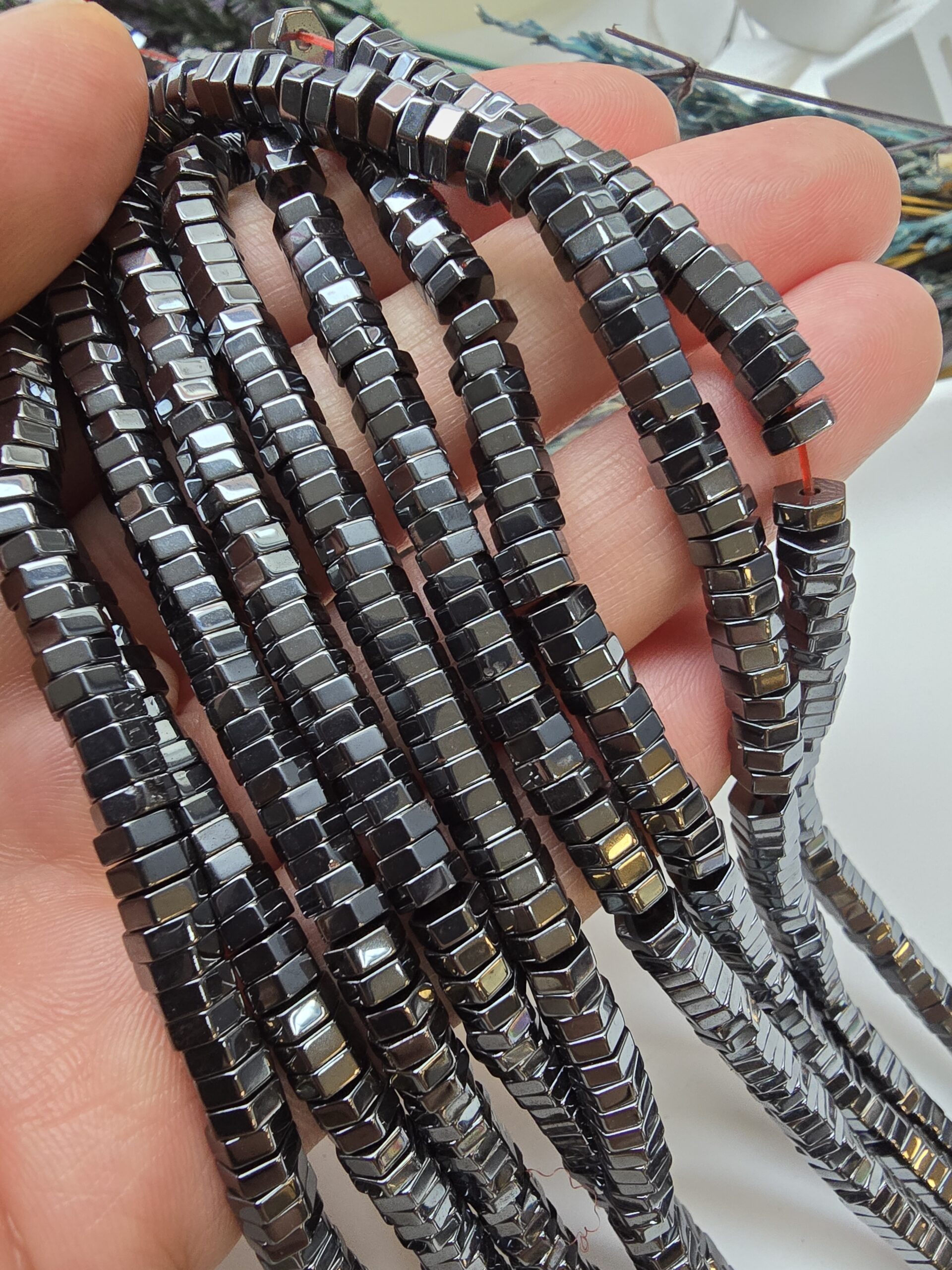 - 1 dizi 6×2 mm vida kesim hematit doğal taş 130 adetten oluşur.