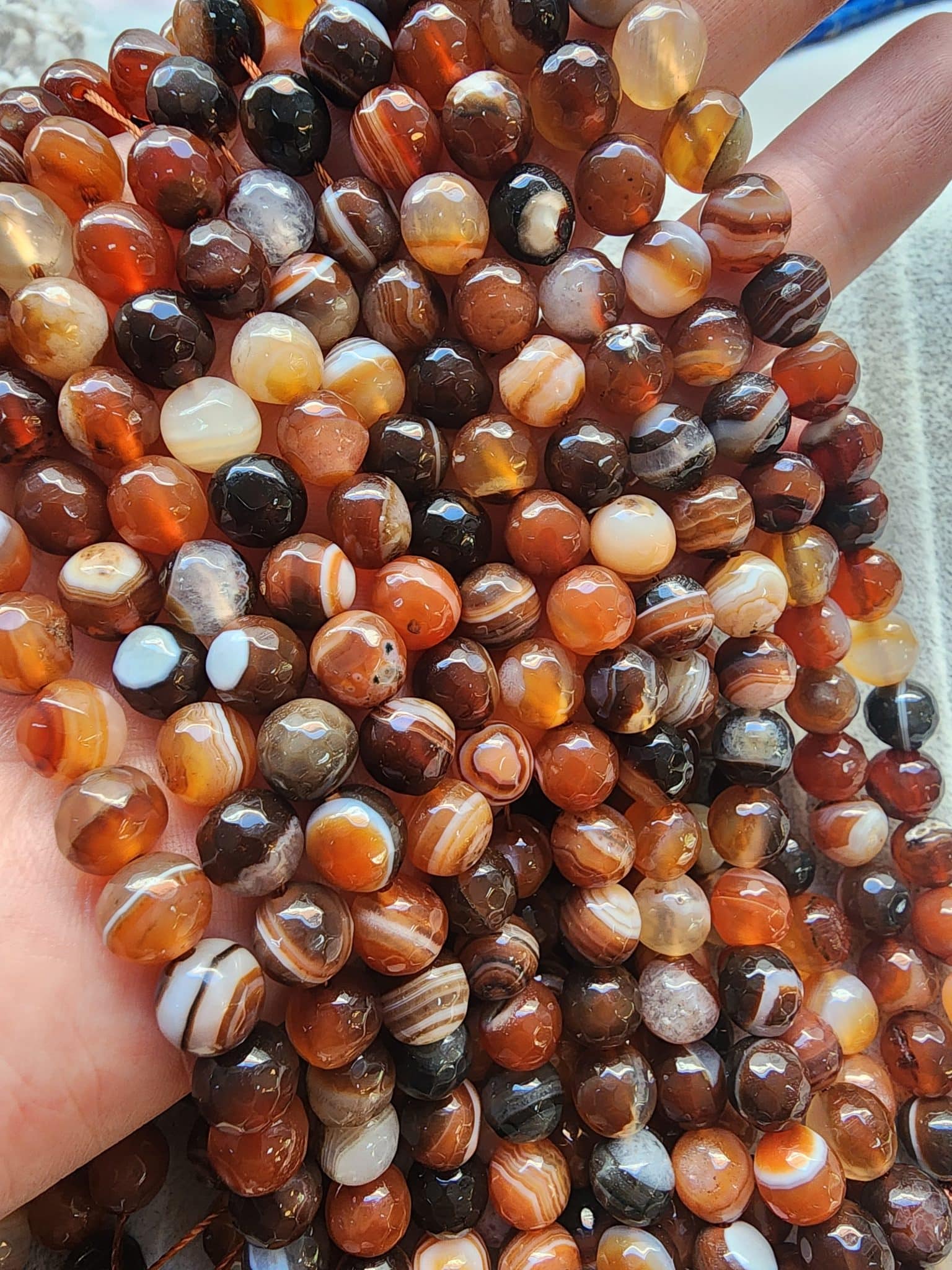 - Fasetli Damarlı Kahve Akik Doğal Taşın çapı 8 mm dir.