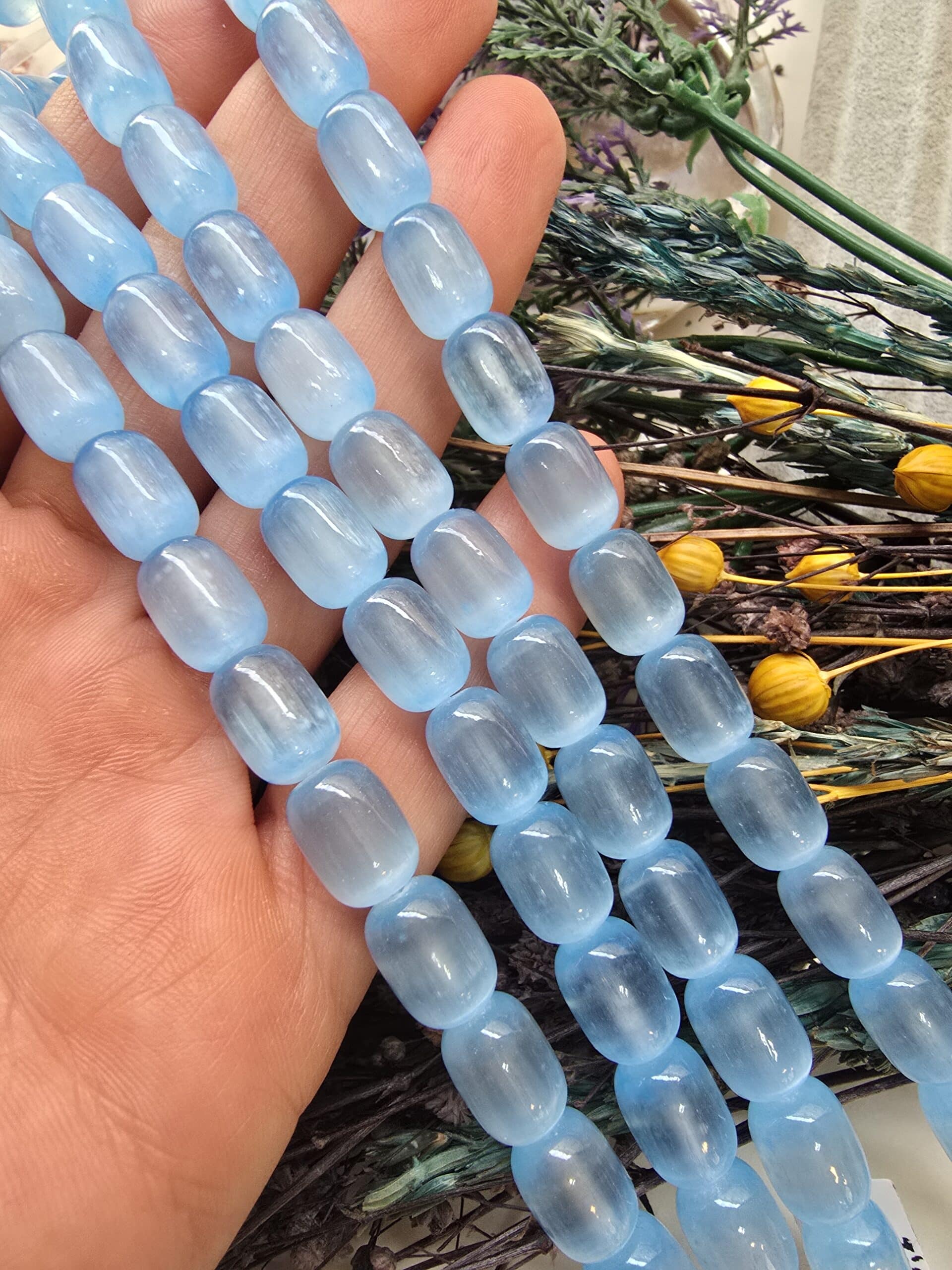 - 1 dizi 8×12 MM Mavi Selenit Taşında 32 Adet Doğal Taş Boncuk Bulunur.
