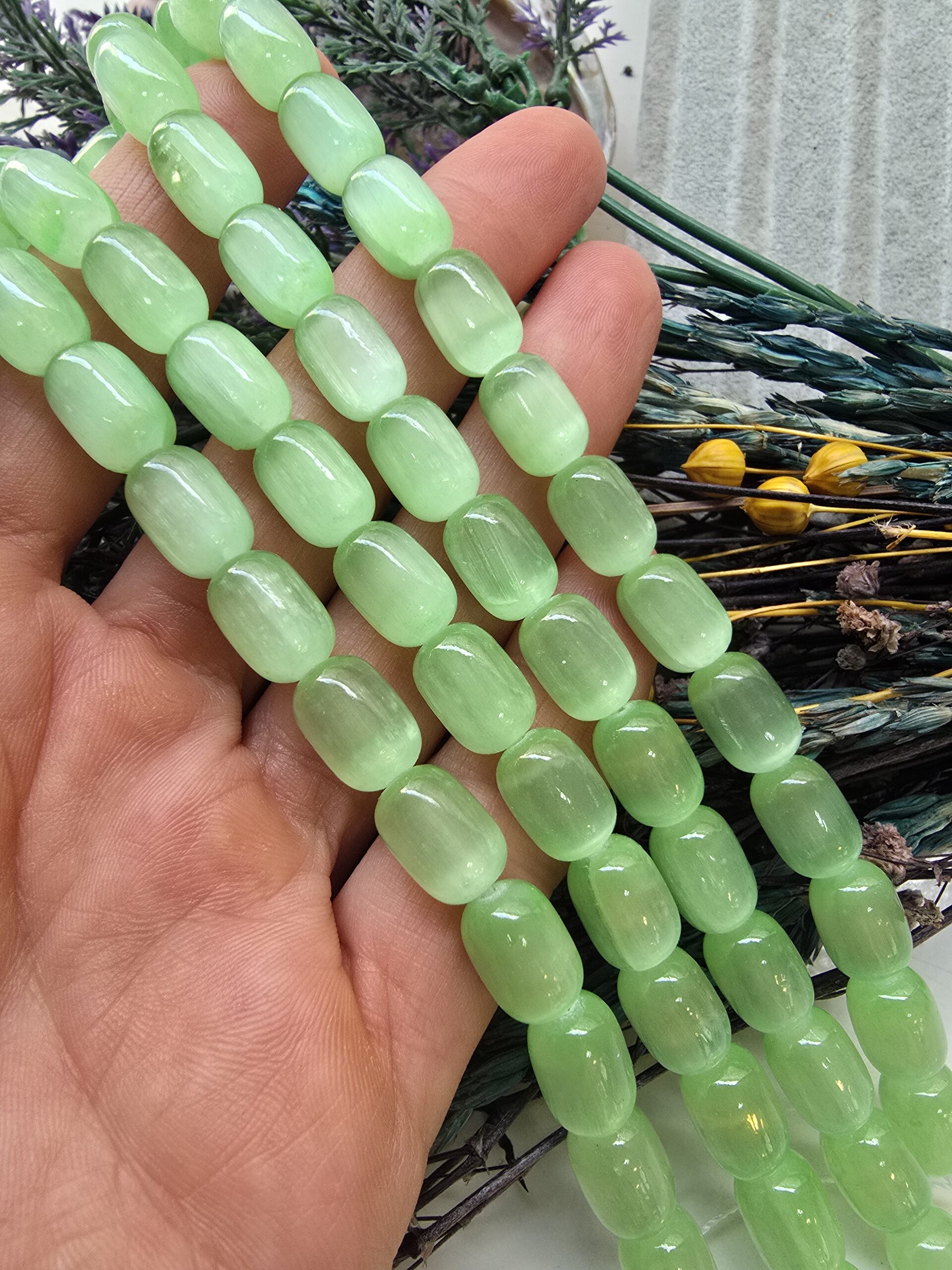 - 1 dizi 8×12 MM Yeşil Selenit Taşında 32 Adet Doğal Taş Boncuk Bulunur.