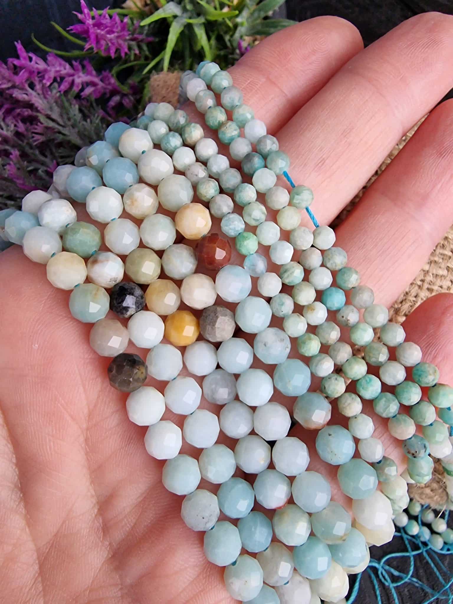 - 1 dizi 4 mm Faset Kesimli Amazonit taşı 98-100 adet doğal taş boncuktan oluşur.