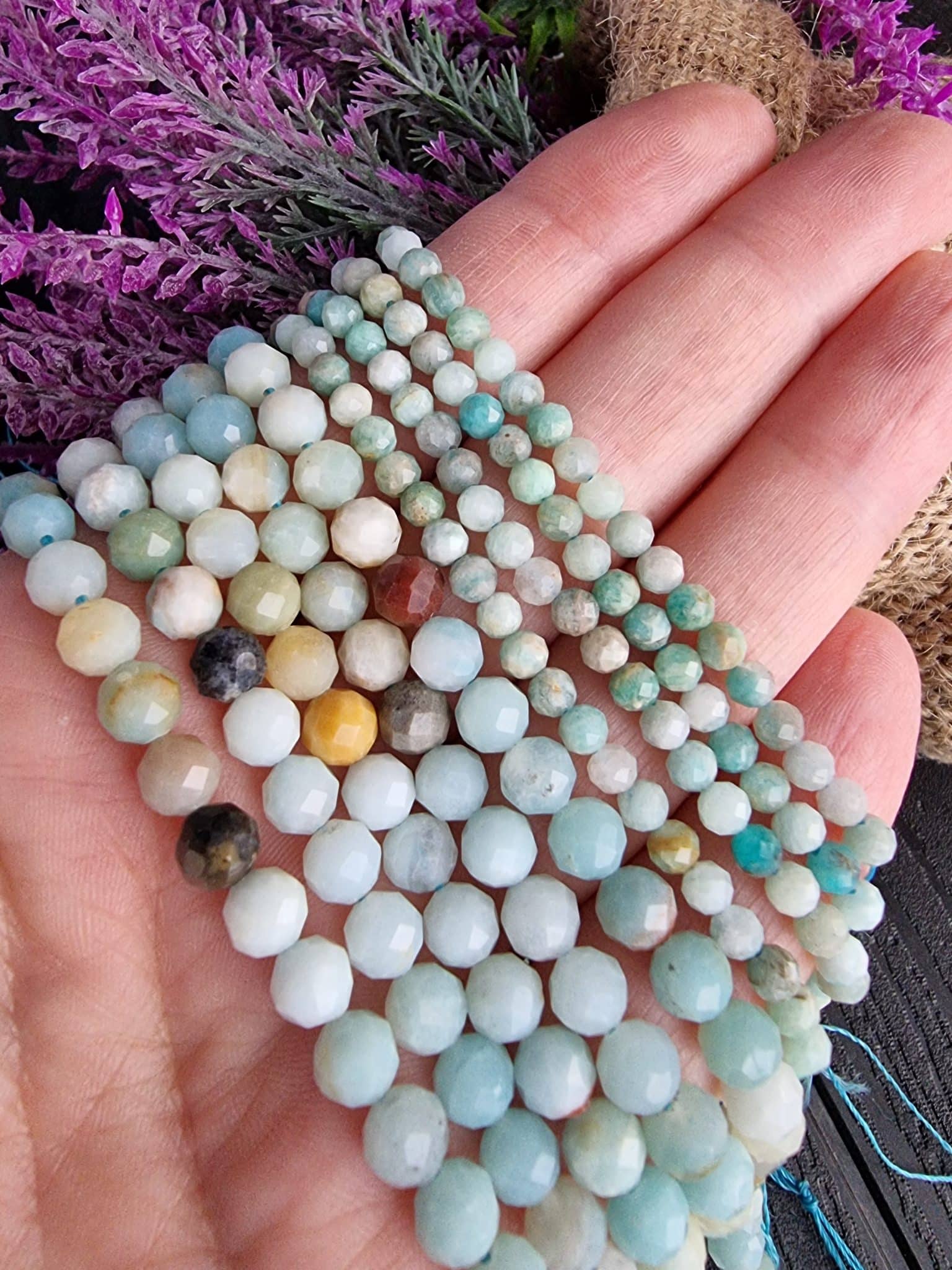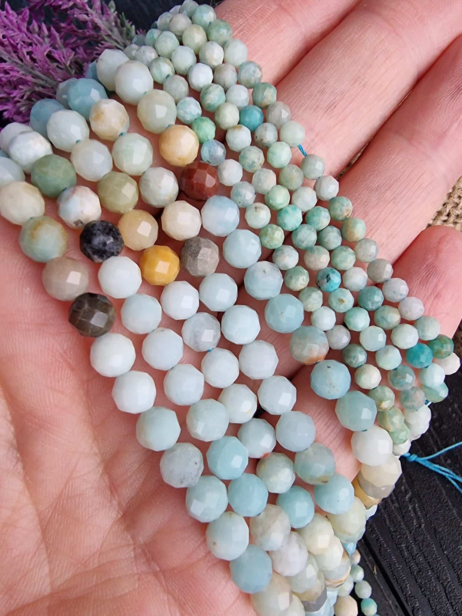 - 1 dizi 6 mm Faset Kesimli Amazonit taşı 62-64 adet doğal taş boncuktan oluşur.