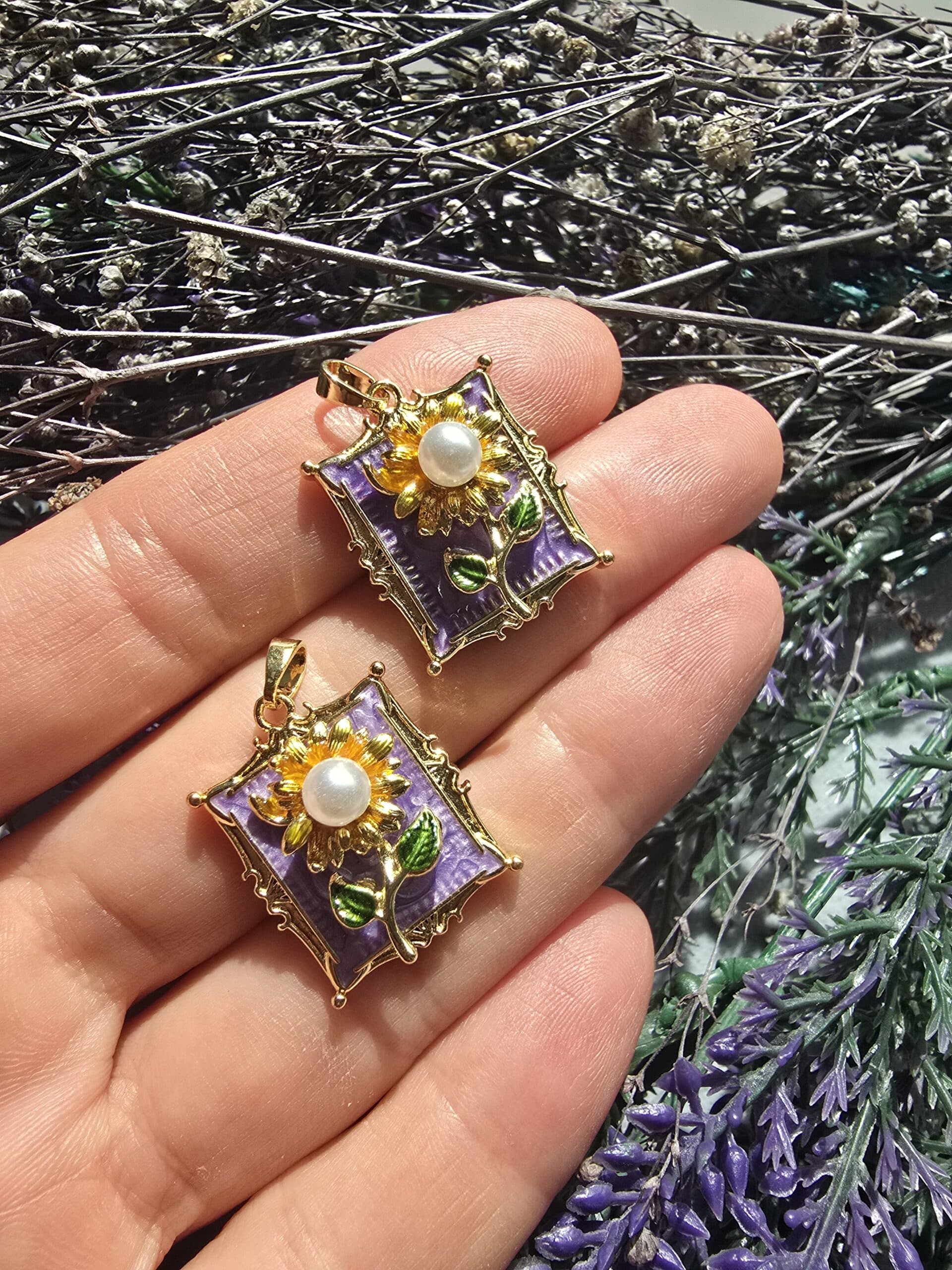 Çiçekli Lila Mineli Çerceve Charm Kolye Ucu