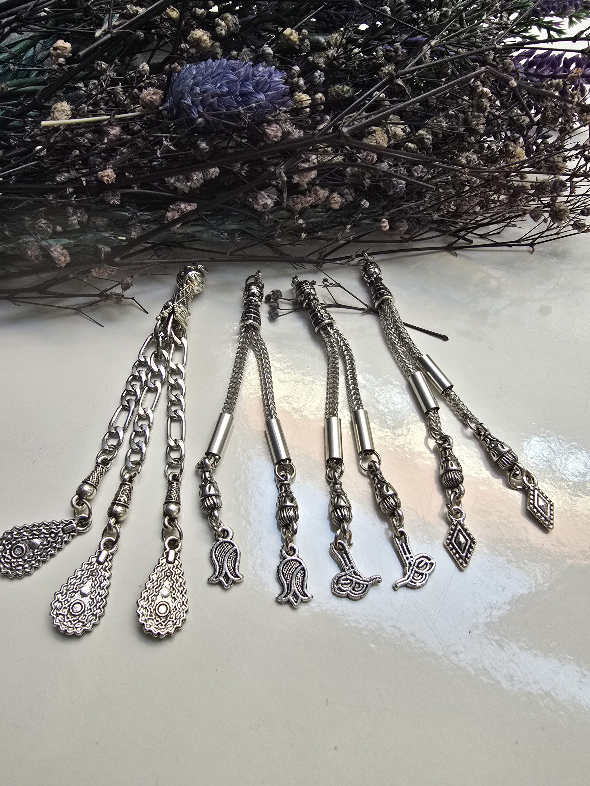 - Metal tesbih püsküllü imameler gümüş renklidir.