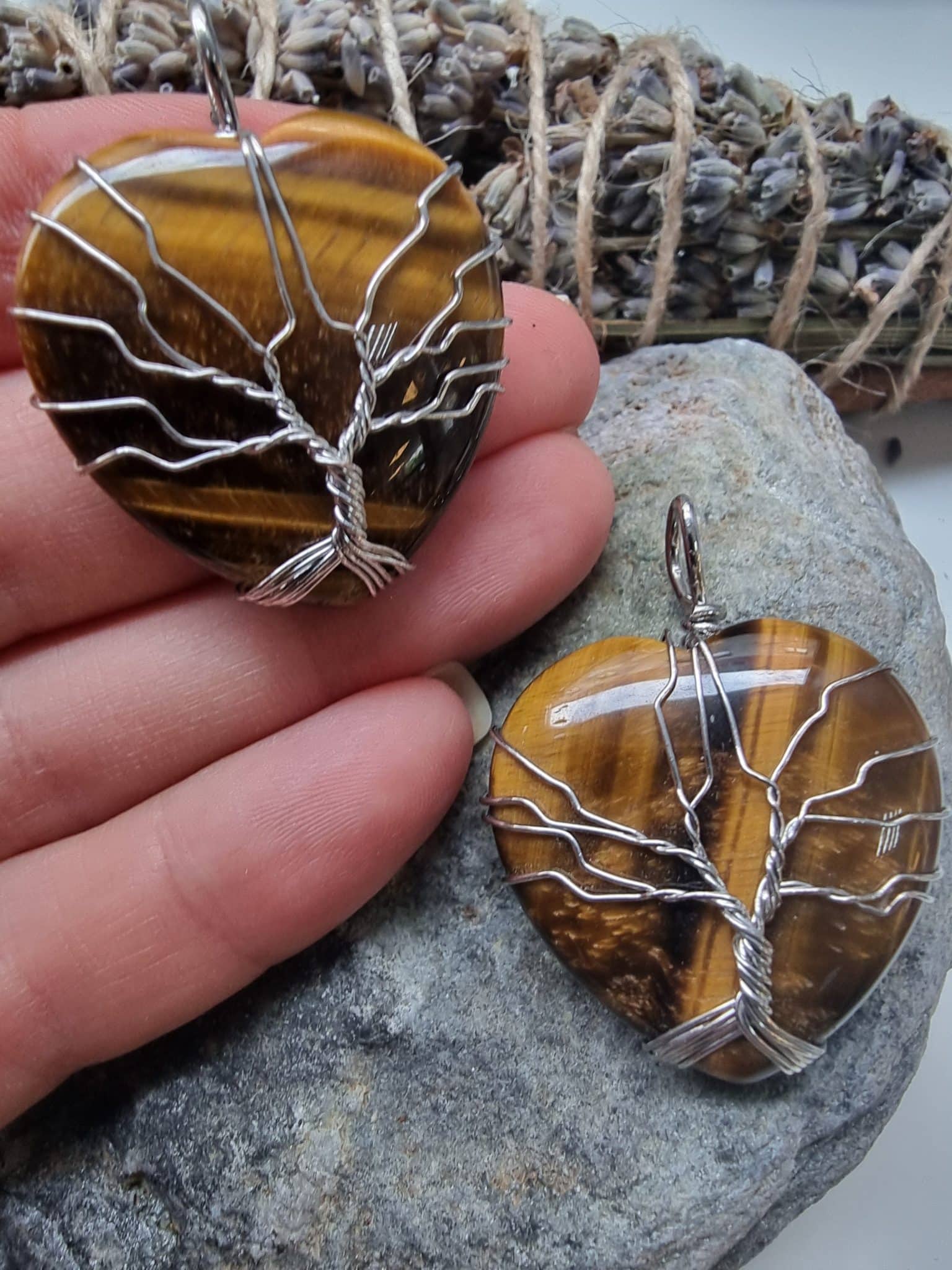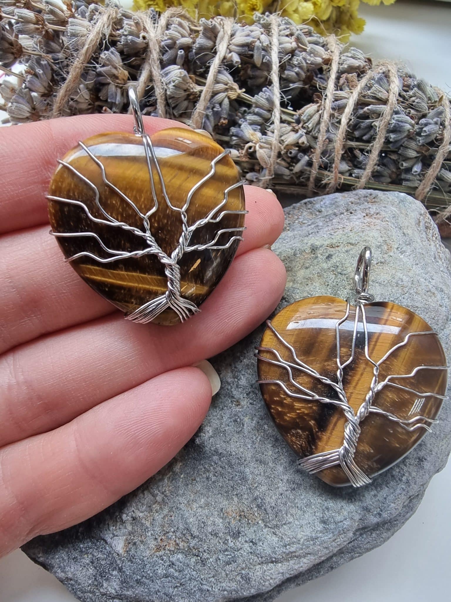 - Kalp şekilli Kaplan Gözü taşları kolye ucudur.