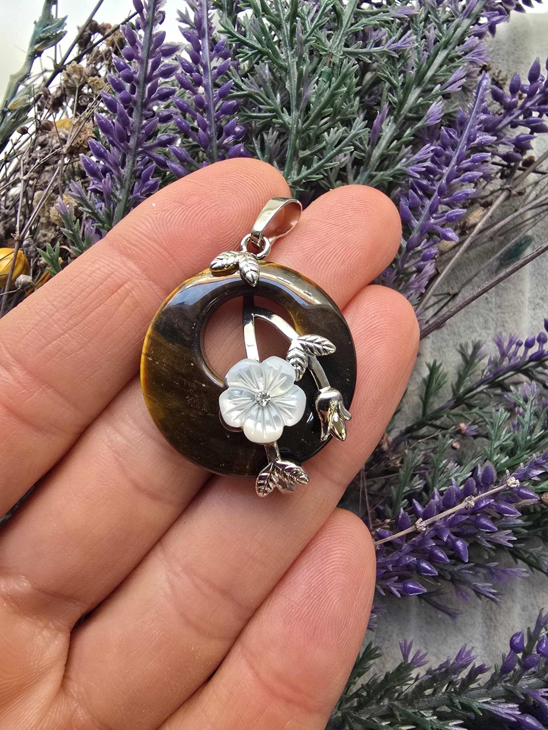 Sedef Çiçekli Kaplan Gözü Taşı Kolye Ucu
